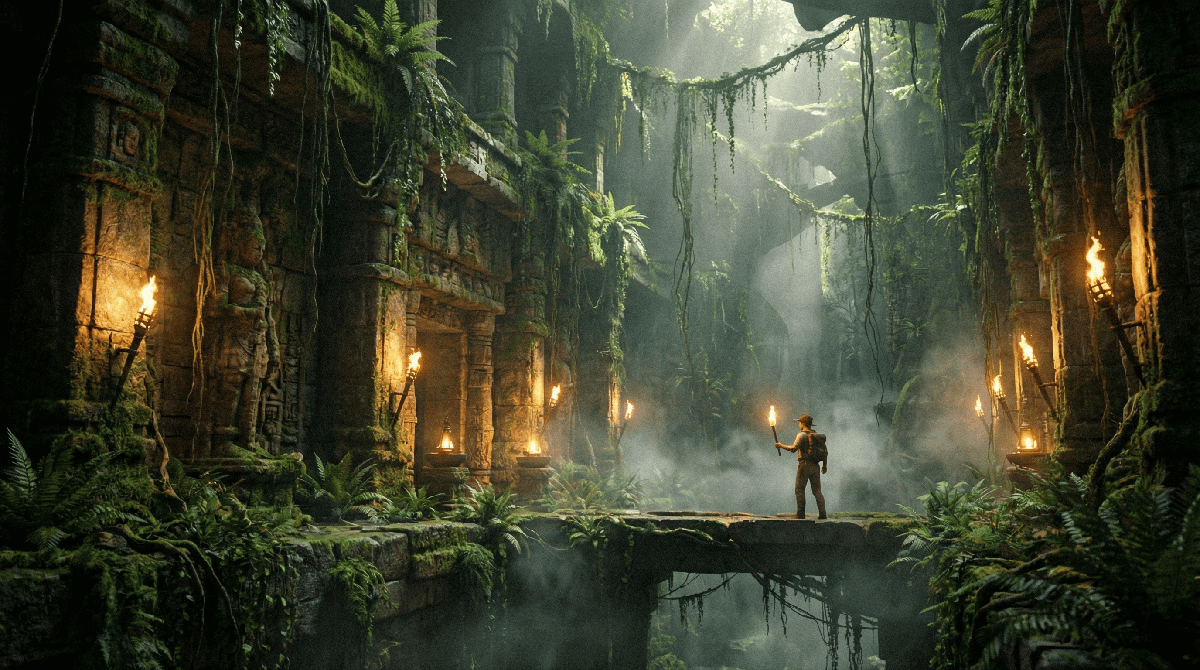 "@[Image 1] as the environment reference. A cinematic camera flythrough moving deeper into the ancient jungle temple, passing between massive stone pillars covered in vines and moss, glowing torches lighting the pathway, drifting fog creating a mysterious atmosphere, golden sunlight shining through the jungle canopy above, dramatic cinematic lighting, epic adventure movie style cinematography, smooth continuous camera movement."