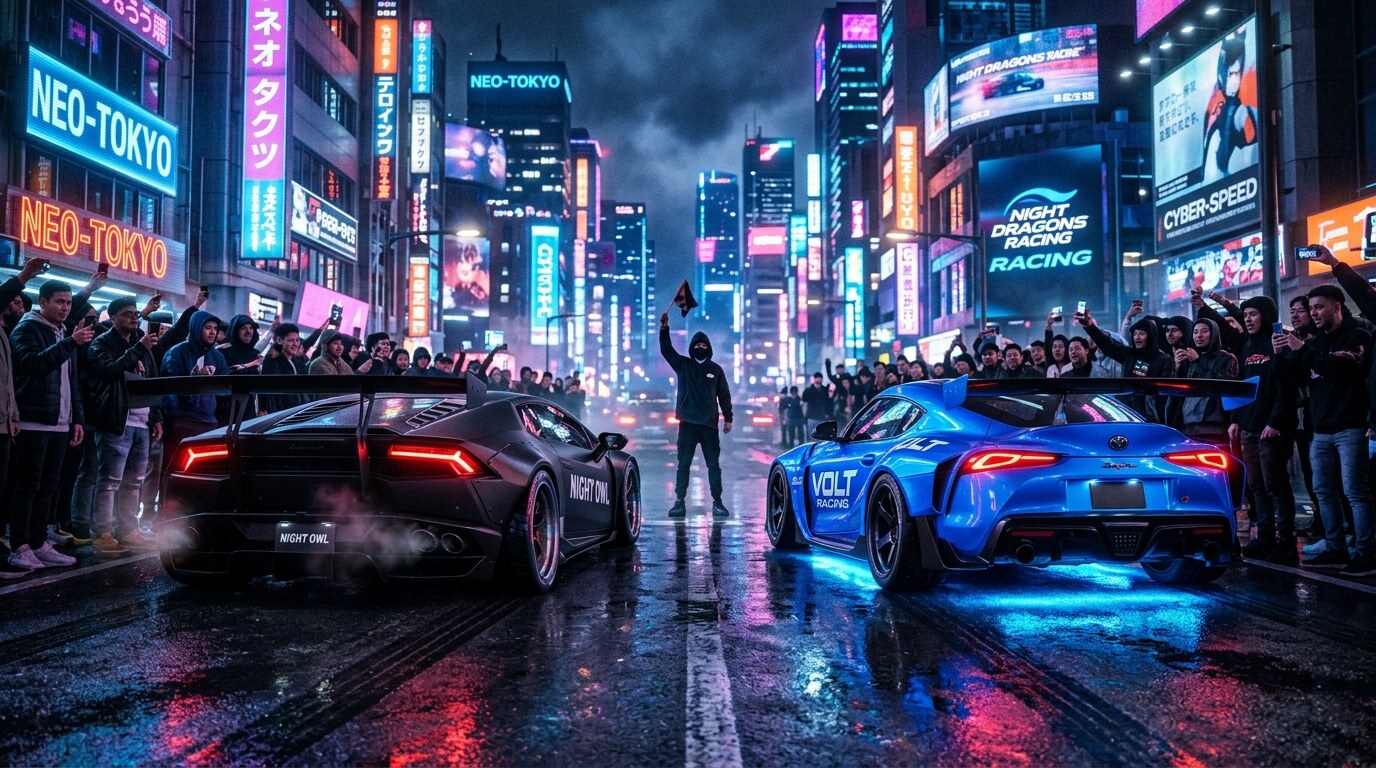 "A cinematic night street racing scene in a neon-lit city. Two high-performance sports cars line up at the starting line on an empty urban street at night. One car is a matte black supercar with aggressive aerodynamic design and glowing red taillights, the other is a bright electric blue sports car with neon underglow lighting illuminating the asphalt beneath it. The street is wet from recent rain, reflecting colorful neon lights from nearby buildings, street signs, and billboards.A crowd of underground street racing spectators surrounds the starting line, standing on sidewalks and leaning against parked cars. Some people are filming with smartphones, others cheering and shouting. A mysterious race starter wearing a hooded jacket stands between the two cars.The engines are revving loudly, exhaust smoke drifting into the cool night air. The camera angle begins low to the ground behind the cars, focusing on spinning wheels and glowing brake discs. The tension builds as the racers grip their steering wheels.The race starter suddenly drops their arm to signal the start. Both cars launch forward violently, tires screeching and smoke bursting from the rear wheels. The camera switches to a dramatic tracking shot following the cars as they accelerate down the neon-lit street at extreme speed.The blue car drifts aggressively around a sharp corner, sparks flying as it nearly scrapes a guardrail. The black car gains on it, roaring past with a burst of acceleration. The city lights blur in the background, creating a sense of extreme speed.Cinematic lighting, dramatic shadows, intense action atmosphere, high detail, realistic reflections on wet pavement, motion blur, slow motion moments, dynamic camera angles like an action movie. Ultra-detailed, dramatic, energetic, Hollywood-style street racing scene."
