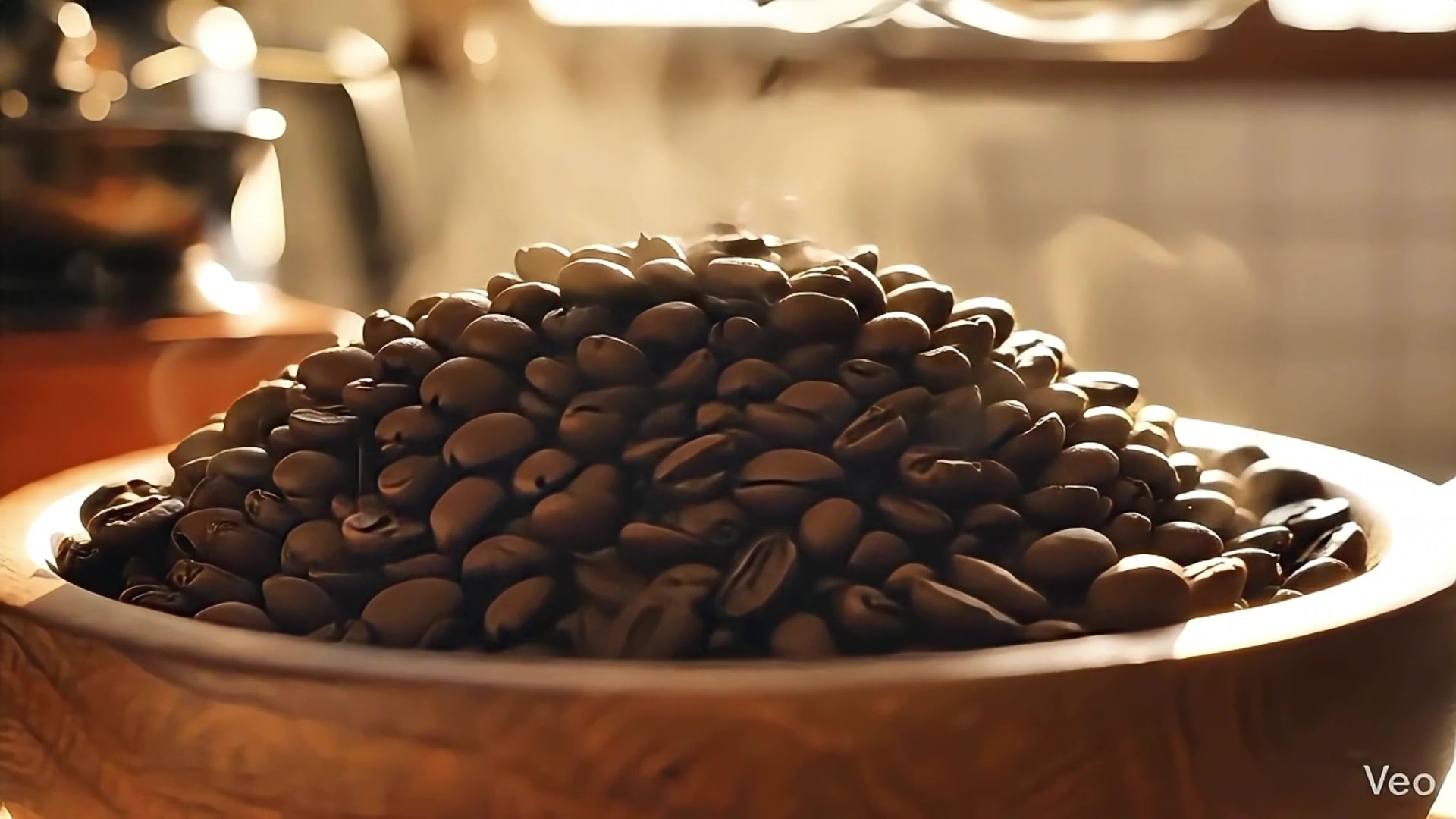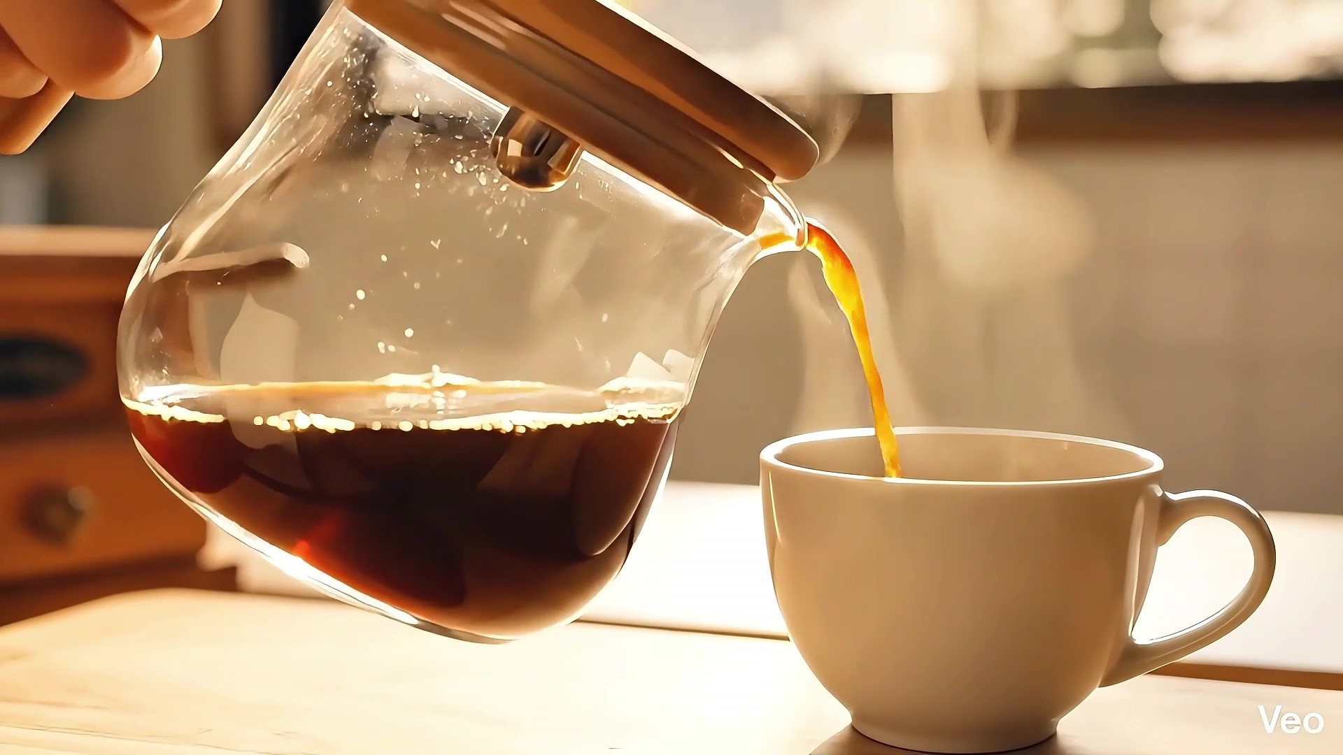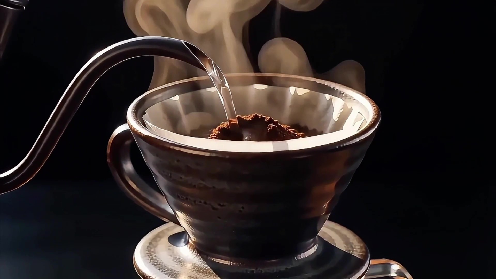 "Ultra-realistic 3D render of making pour-over coffee, macro cinematography. Physically accurate fluid dynamics of boiling water pouring from a perfect metallic gooseneck kettle. Highly detailed coffee beans with organic micro-textures and realistic subsurface scattering. True volumetric steam, absolute mesh stability, accurate index of refraction (IOR) for glass and liquid, ray-traced caustics, cinematic warm lighting, high frame rate, strict temporal coherence, octane render engine style, physically accurate motion, zero morphing, consistent geometry."